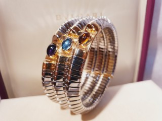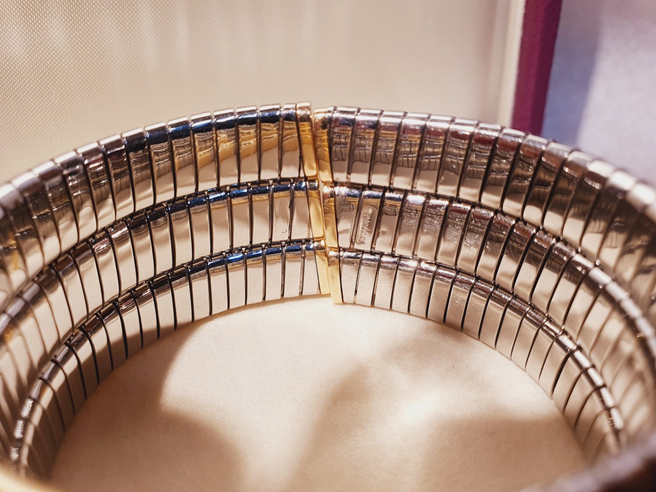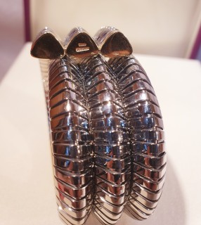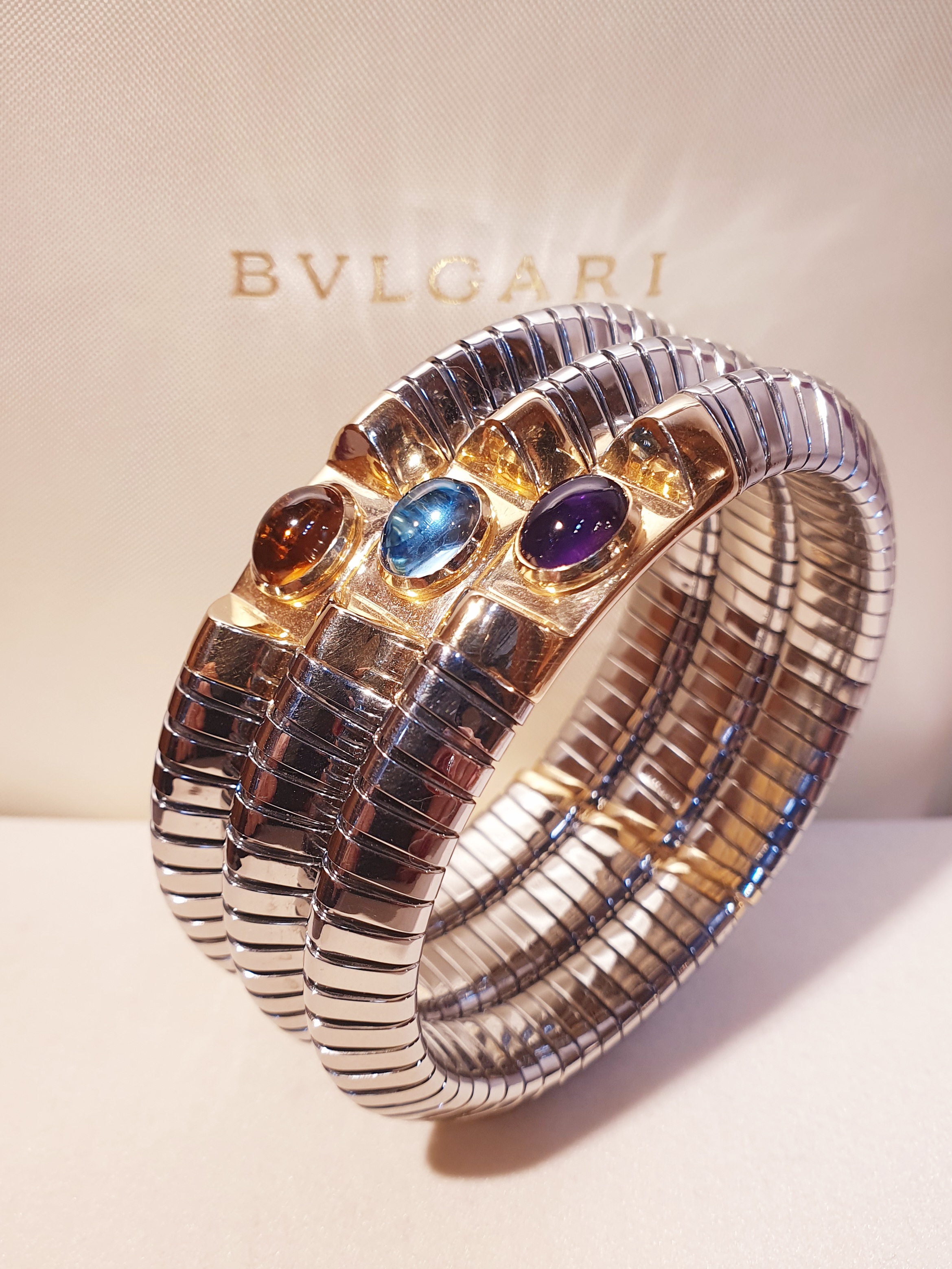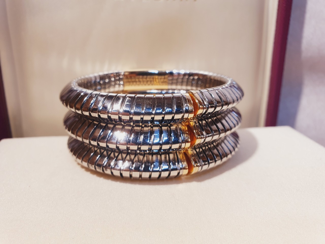 Iconico bracciale BVLGARI realizzato con la celebre lavorazione Tubogas, simbolo di innovazione e maestria orafa della Maison.