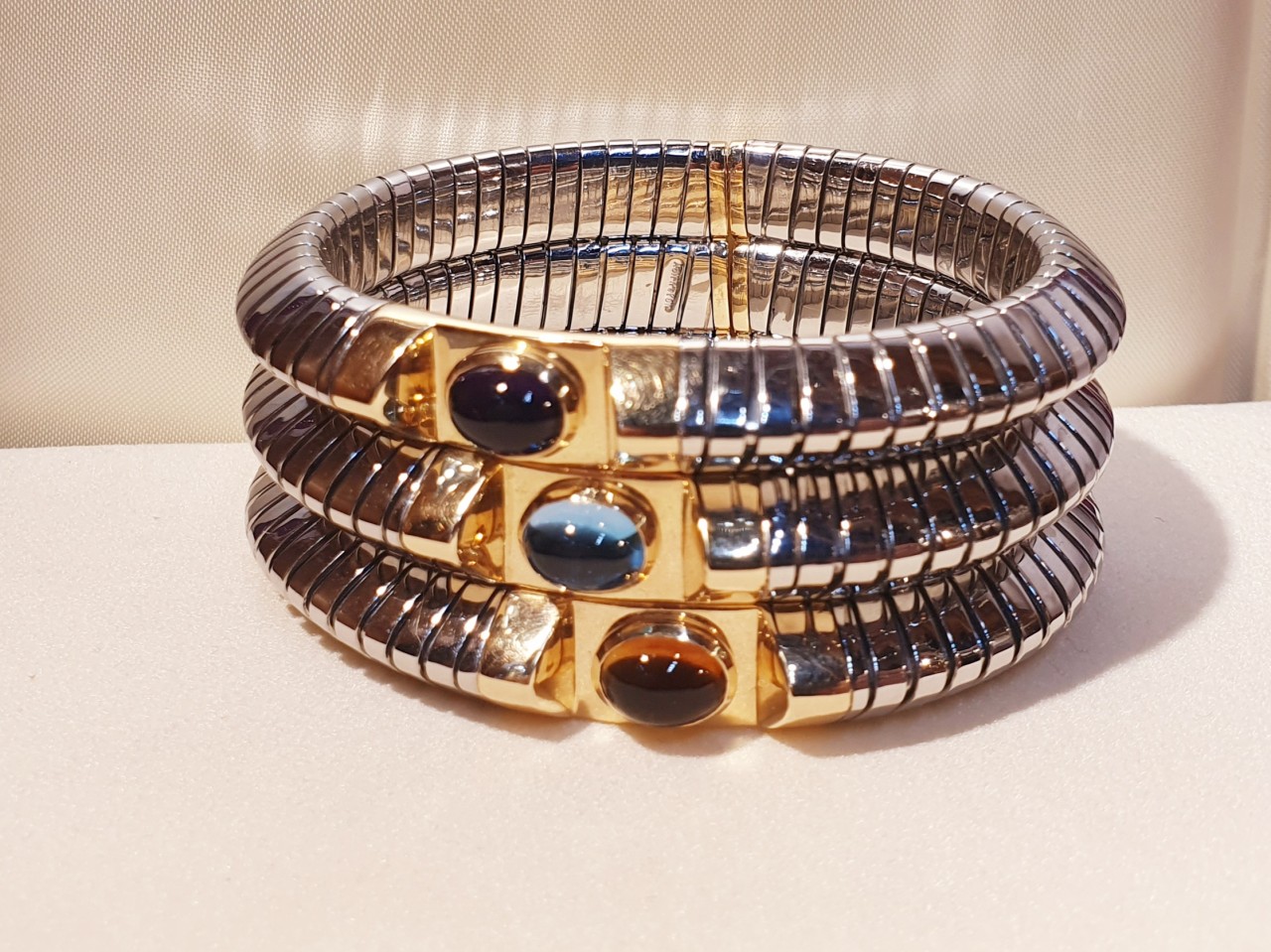 Ogni fascia è impreziosita da un elemento in oro 18 kt, arricchito da pietre cabochon naturali dai colori intensi e raffinati: topazio giallo e azzurro profondo e ametista , che creano un sofisticato gioco cromatico e un forte impatto visivo.