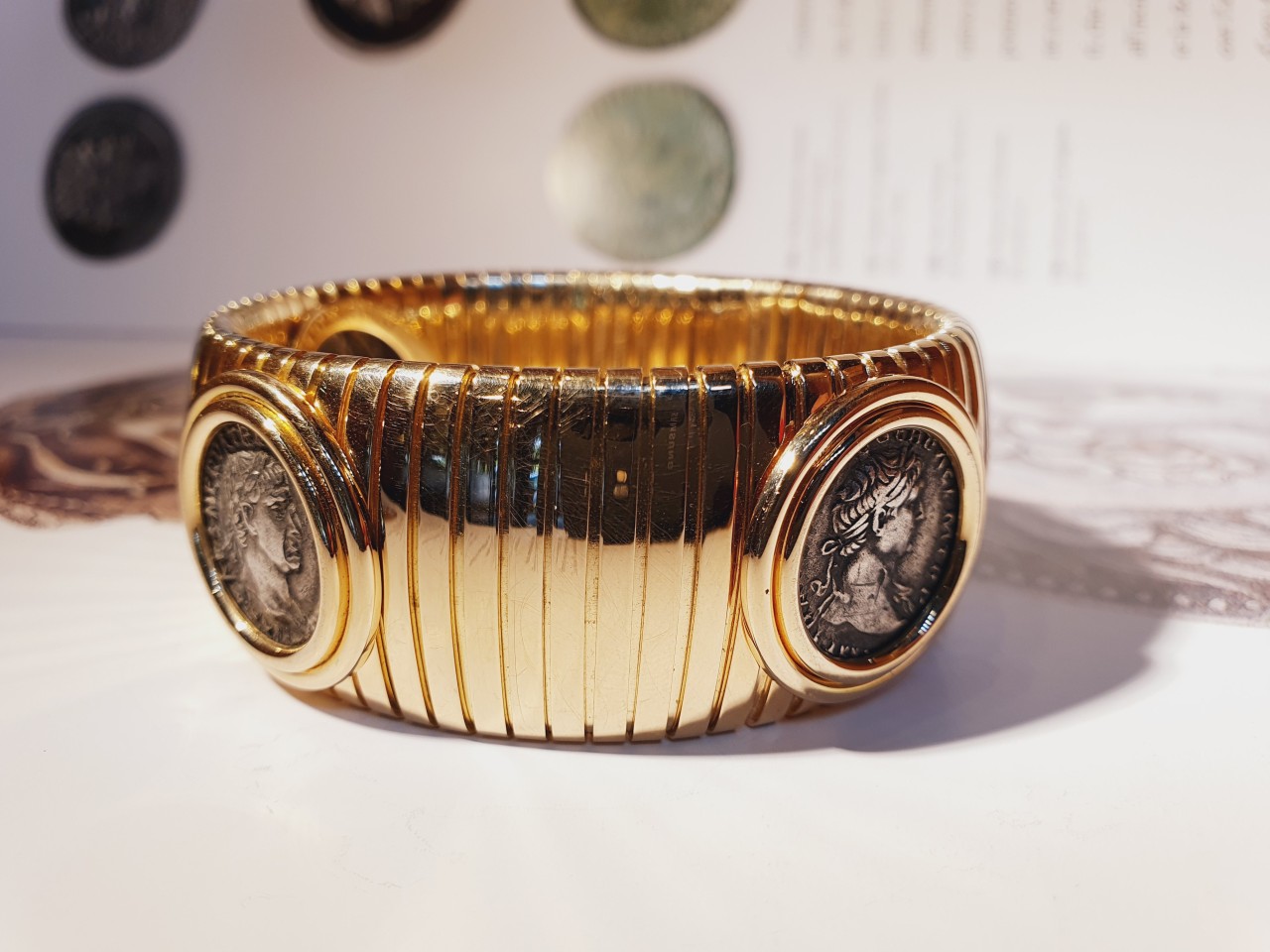 Importante bracciale Tubogas in oro giallo 18 kt e tre monete romane in argento