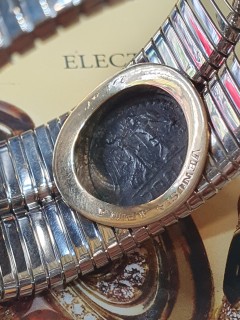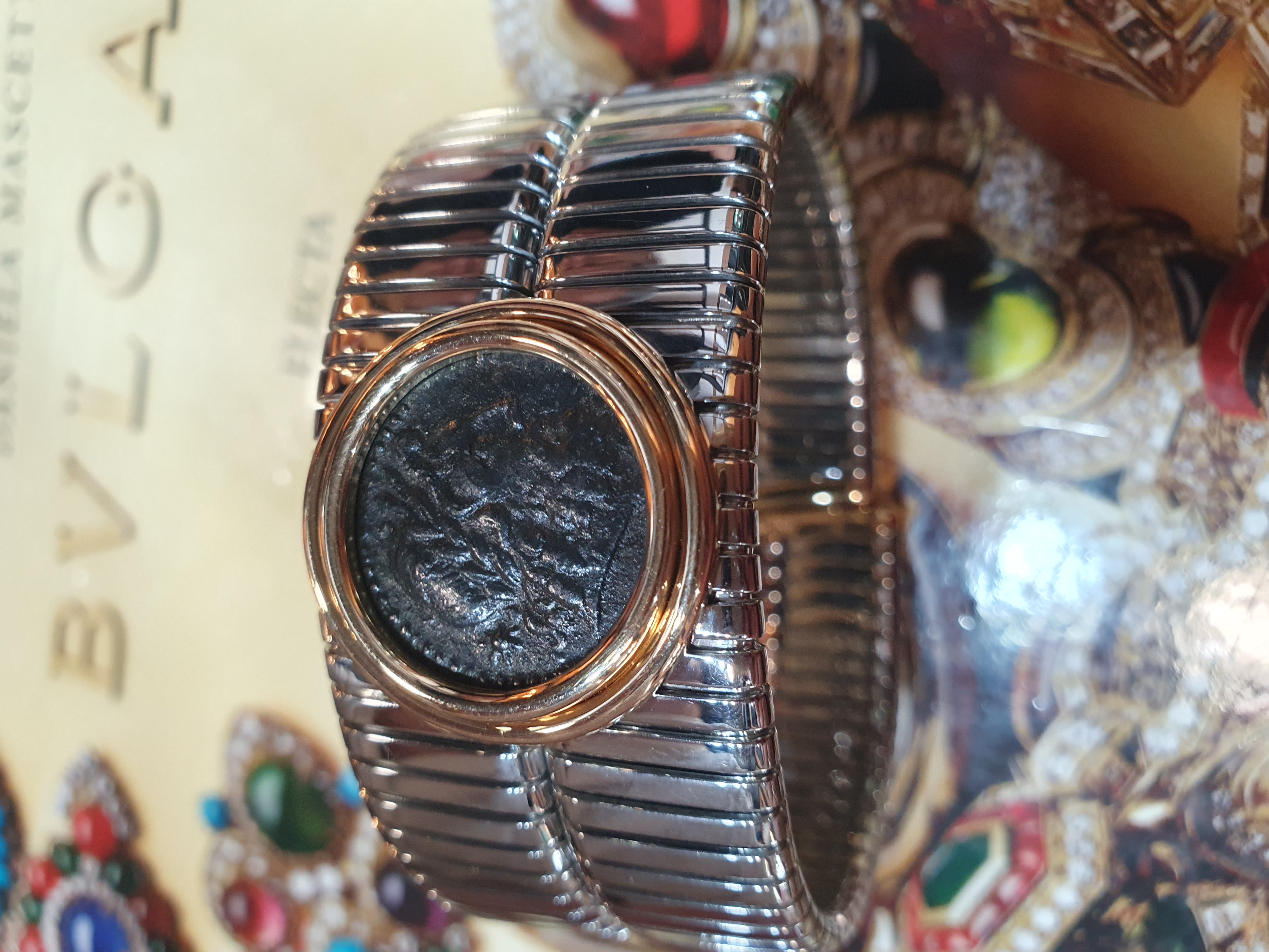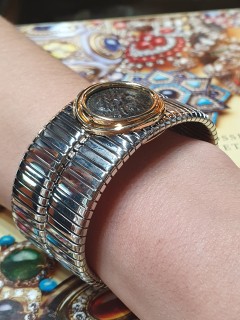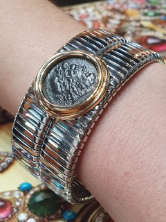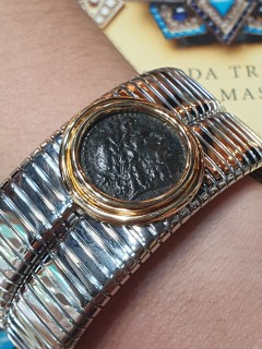 Al centro, come una rara gemma, è racchiusa in castone d'oro una antica moneta Romana in bronzo.