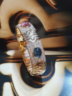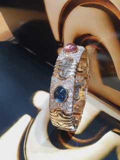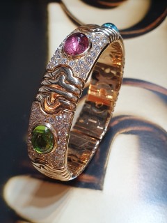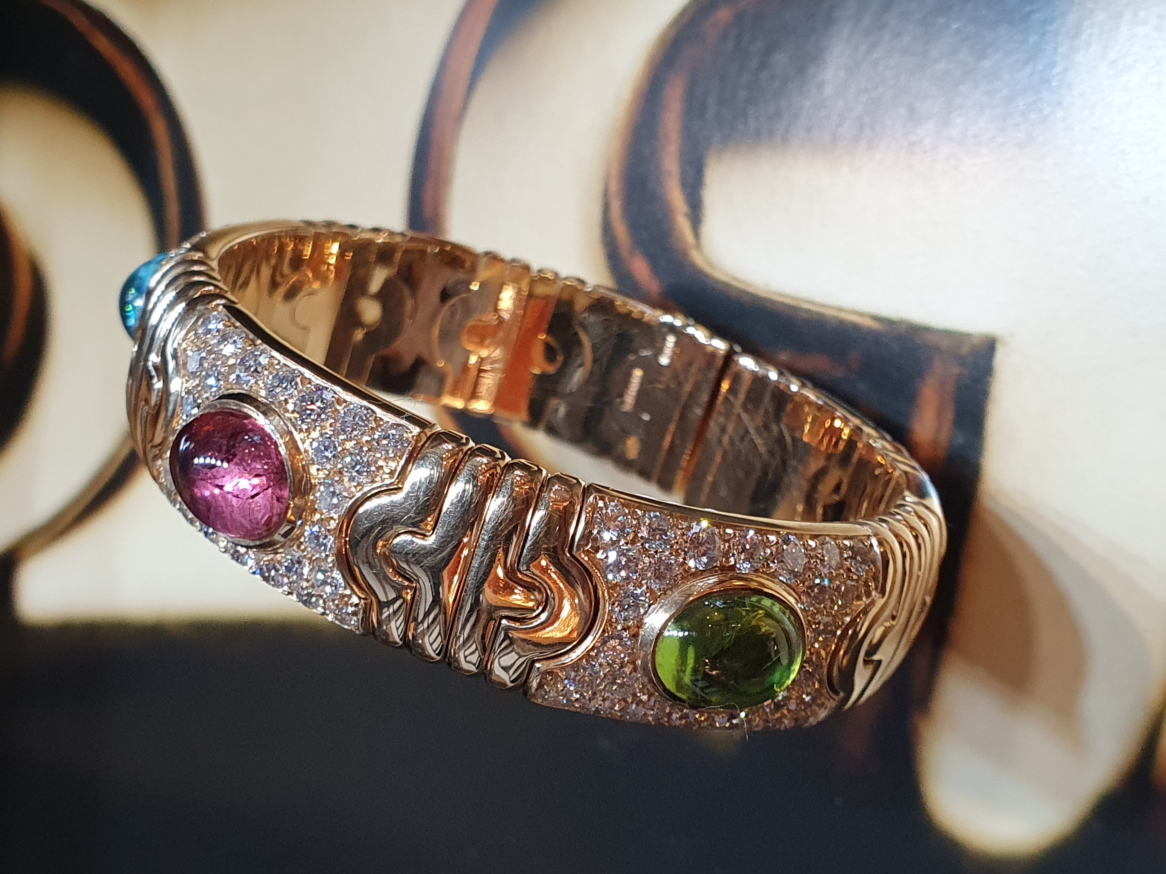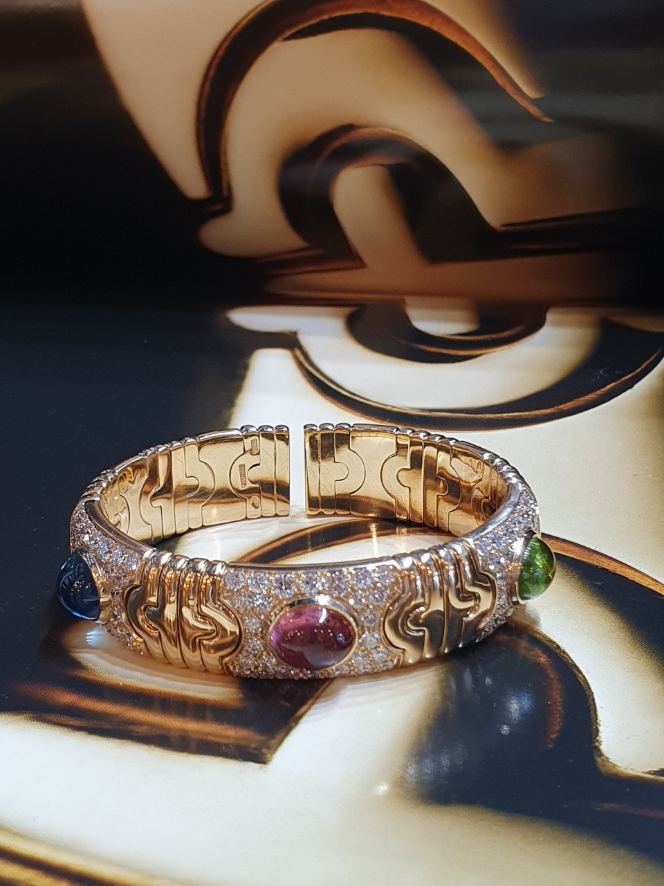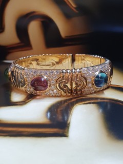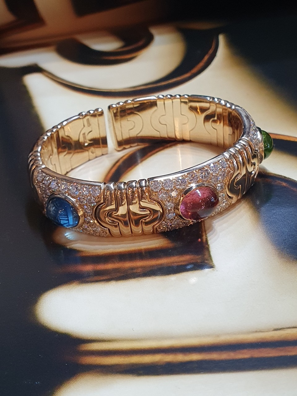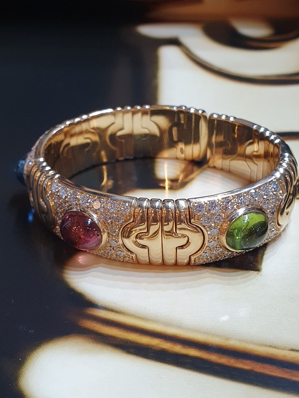 L' iconica maglia Parentesi è arricchita da un magnifico pavè di diamanti per circa 5 ct. Tre gemme taglio cabochon, completano il bracciale donando allegria con i loro colori intensi e vivaci.