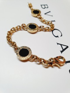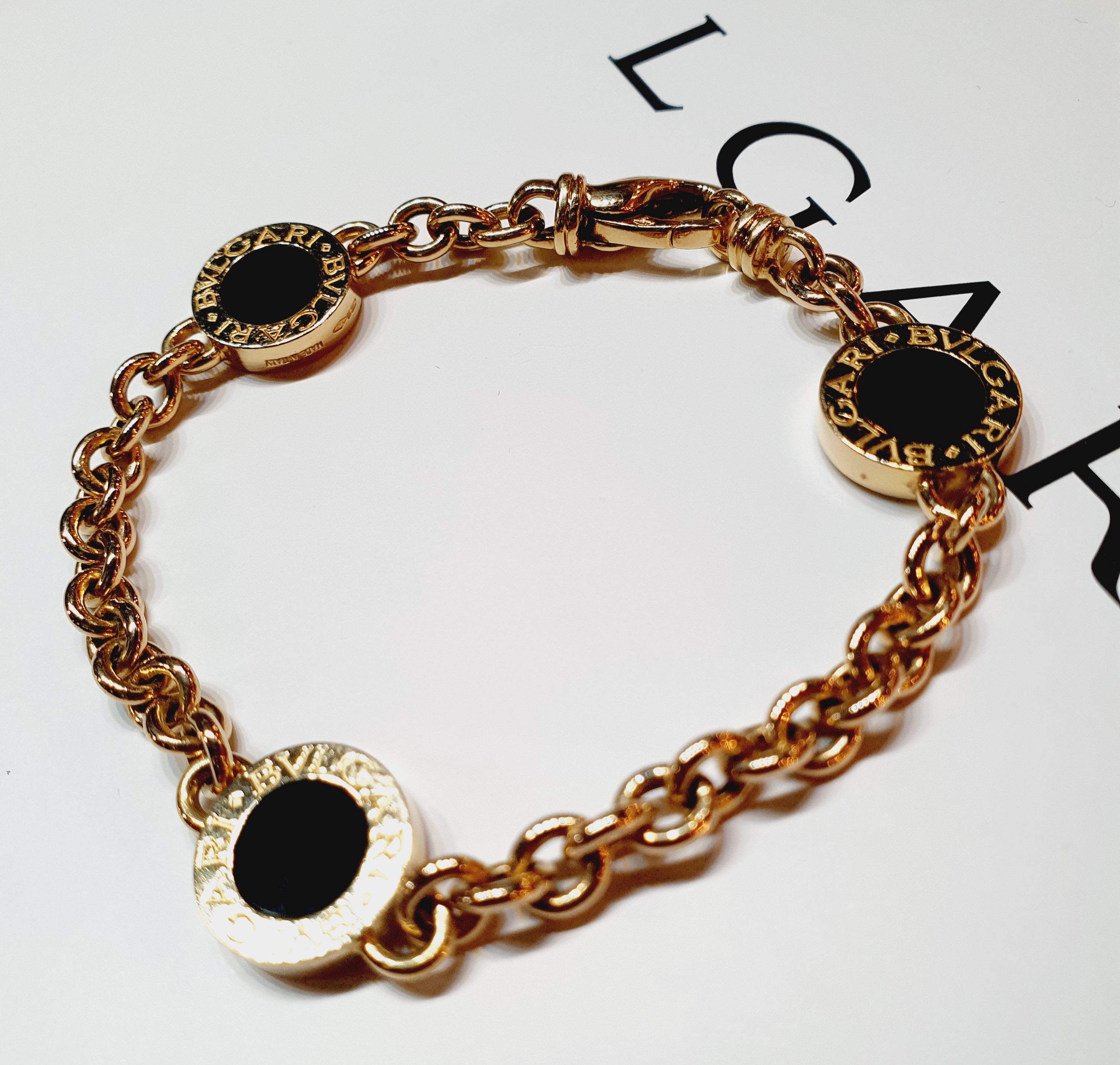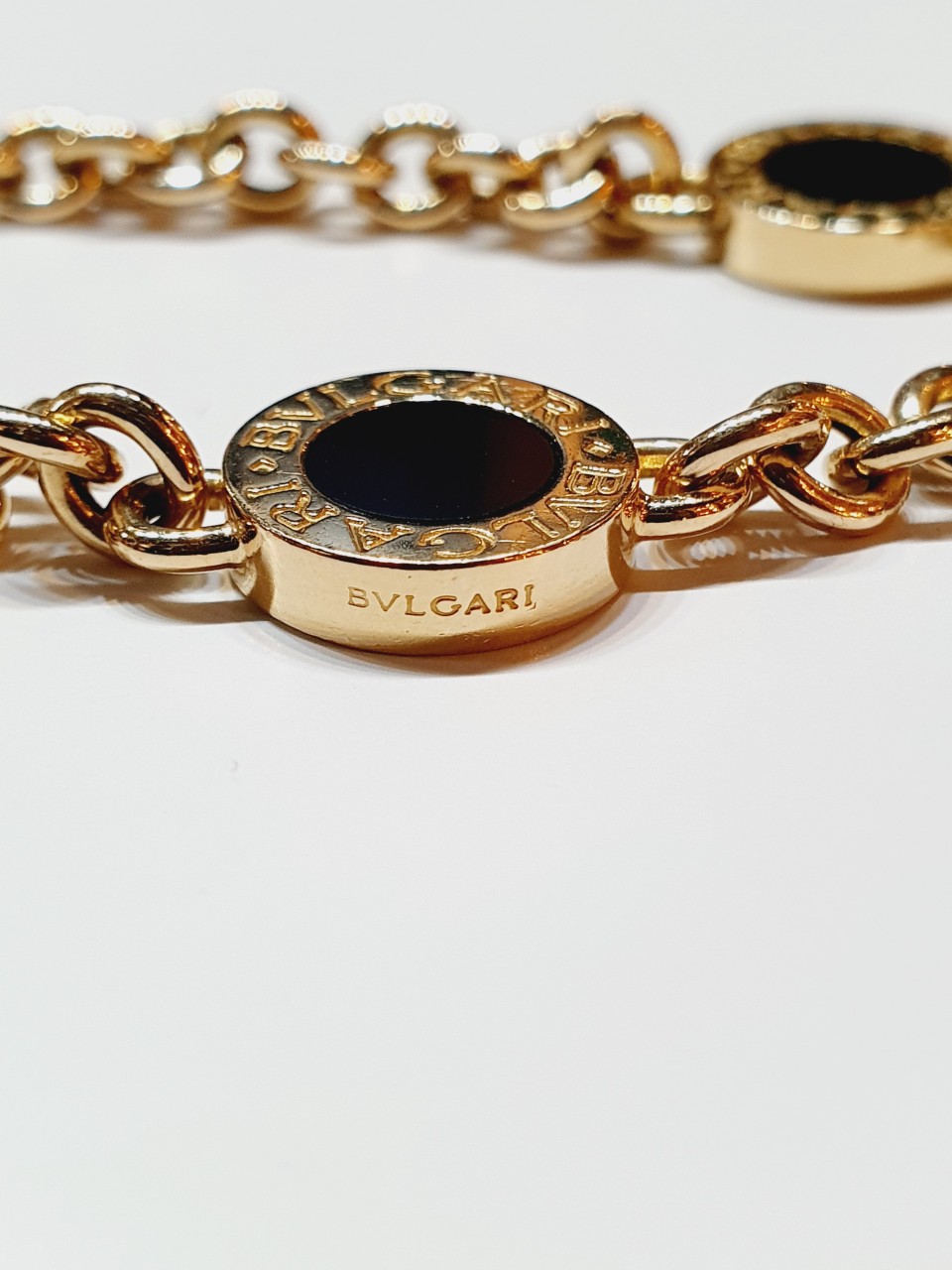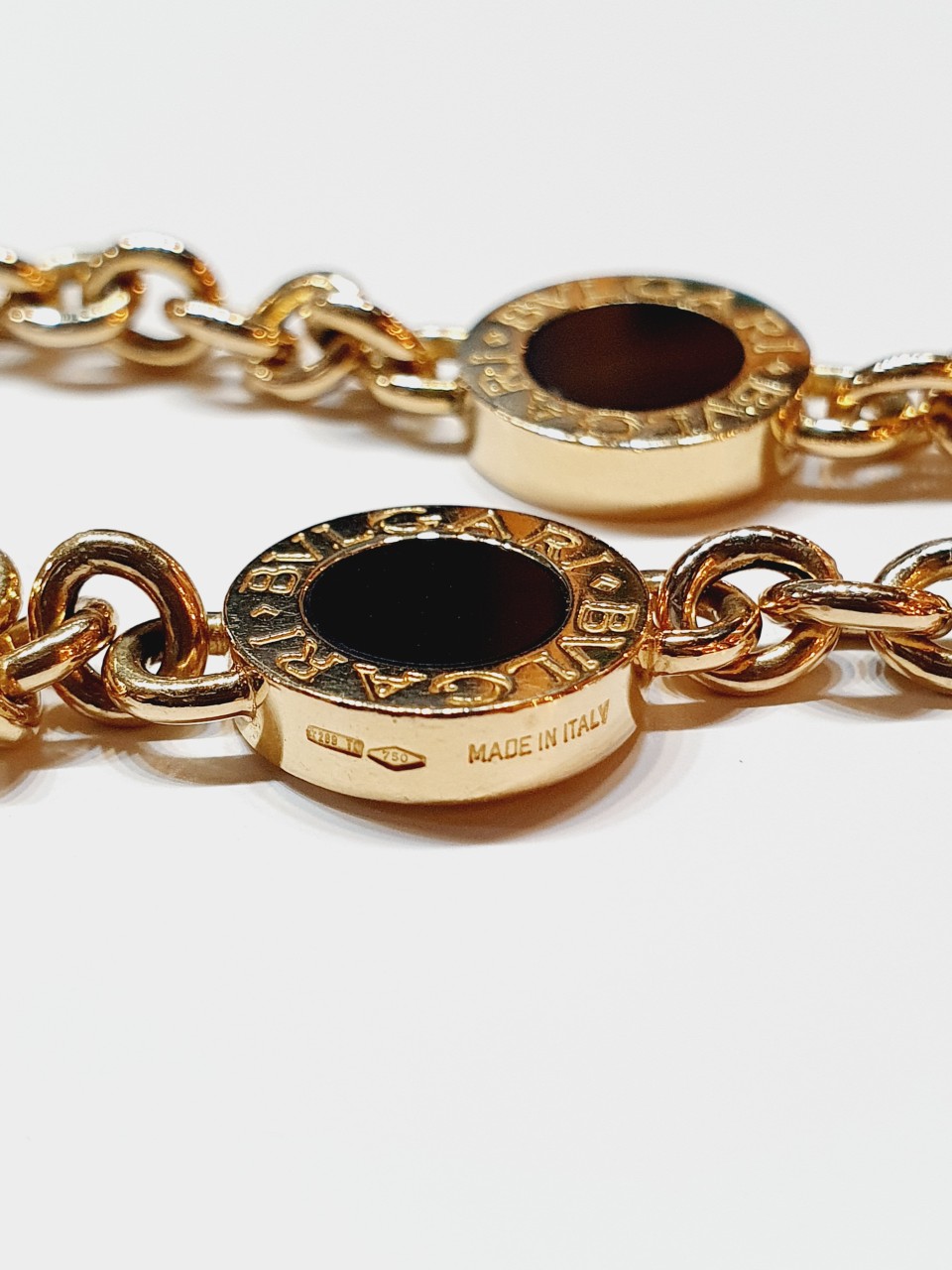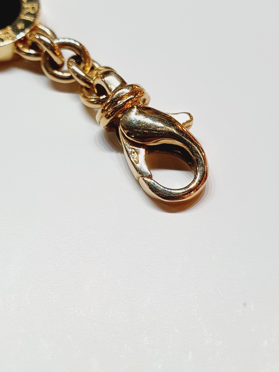 adornato da elementi girevoli in onice, inseriti in una catena a maglie grosse in oro 18 kt