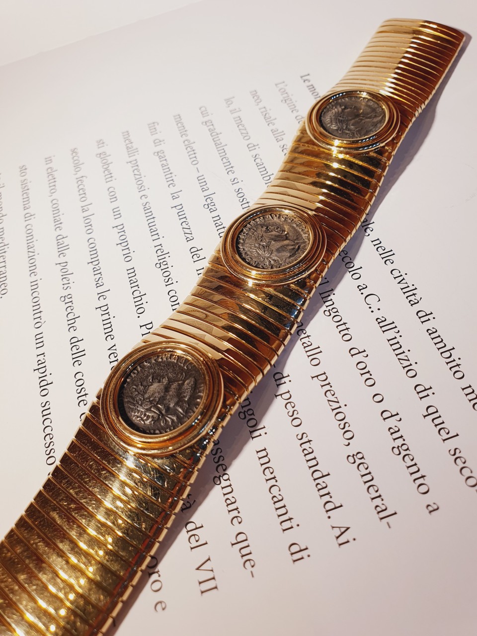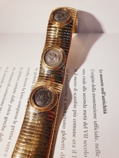 Importante bracciale Tubogas in oro giallo 18 kt e tre monete romane in argento