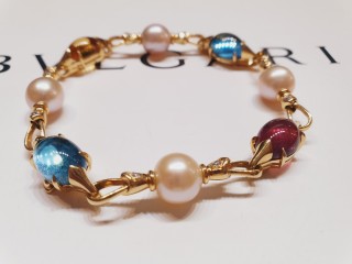 Maglie in oro giallo intrecciano gemme di colore e perle rosate, piccoli diamanti impreziosiscono il bracciale