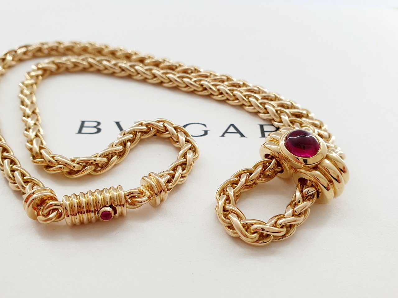 Maglia cordone in oro giallo e centrale saliscendi con rubino cabochon